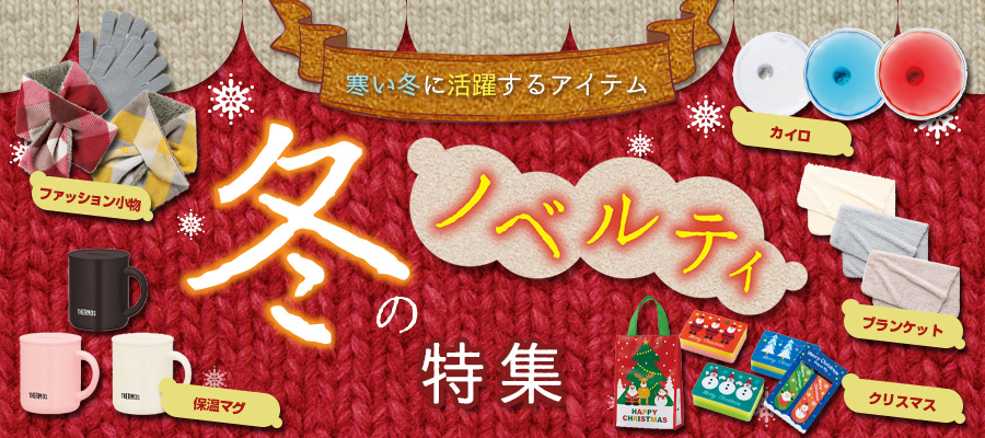 冬は「クリスマス」「お正月」など特別なイベントの多い季節となり、ノベルティをオリジナル製作される企業・店舗様も多数いらっしゃいます。そこで当ページでは、冬の季節感にマッチしたあったかグッズや年末年始に役立つお掃除グッズなど、冬のノベルティ発注にお薦めのアイテムを多数ご紹介いたします。寒い季節に貰って嬉しい保温性あるボトルやブランケット、カイロなどを激安価格で名入れプリント制作してノベルティ販売いたしますので、ぜひ当通販サイトをご活用ください。
