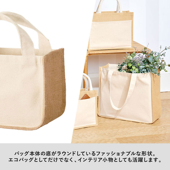 「ジュート&キャンバスコンビトート(L)」は、ジュート素材の幅広のマチがアクセントになったキャンバス×ジュートの異素材コンビトートです。底がラウンドした可愛らしい形状は、ファッションアイテムとしてはもちろんインテリア小物としても活躍します。キャンバス生地の名入れ範囲には繊細な線画イラストも格安価格で印刷できますので、アパレルショップの記念品やフラワーショップの有料エコバッグなどにぜひご活用下さいませ。