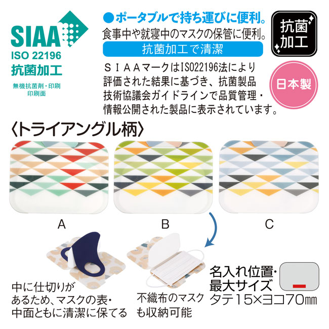 「マスクレスト(抗菌加工)(トライアングル柄)」は、毎日のマスクの持ち歩きや、食事の際の一時保管などに便利なアイテム。抗菌加工が施されているので衛生的に活用できます。中には仕切りがあり、布マスクなどを掛けることで表・中面ともに清潔に保つことが可能です。お洒落なトライアングル柄で男女問わず配布がお薦めですので、企業名や店舗ロゴ入りの特注ノベルティ制作にいかがでしょうか。