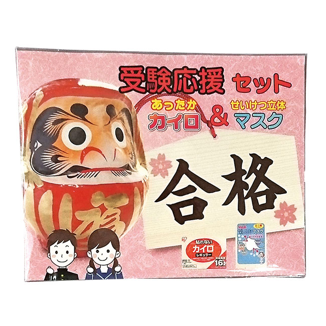 冬場が正念場である受験生たちを風邪や体調不良から守ってくれる、使い捨てタイプのカイロとマスクのセットになります。「合格」と大きく書かれたパッケージで作成され縁起も良く、学習塾や予備校などの配布ノベルティとしても定番となっているアイテムです。