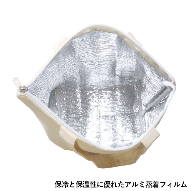 生成り色のコットン生地が優しい印象を与える「コットン保冷温トートバッグ」は、内側がアルミ蒸着仕様の保冷温トートバッグ。320×130×300mmと飲料水のボトルが入る大きさで、肩に掛けられるほど長い持ち手がスーパーへの買い出し用にぴったりです。ナチュラルなコットン生地にはロゴやイラストの名入れが映えますので、スーパーの周年ノベルティやカフェの物販グッズなどに当店での格安オーダーメイドをご活用下さいませ。