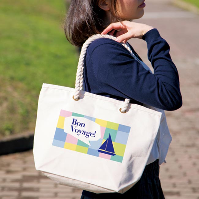 マリンテイストなロープの持ち手が可愛い約14オンスの厚手コットン生地を使用したトートバッグです。カジュアルなコーデと相性が良くファッション性の高いアイテムとして物販グッズや数量限定ノベルティなど様々な販路で活躍しています。A4サイズが収納出来ますので春夏の出勤や通学、お出かけと毎日使いに重宝しそうです。本体にはブランドロゴやショップネームなどお好きなデザインをプリントする事ができ、1色からフルカラーまで幅広く対応しております。