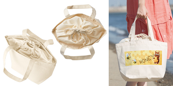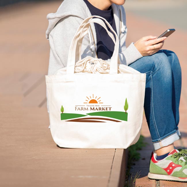 中に入れた荷物が見えにくく、そして落ちにくい便利な巾着タイプのトートバッグとなっています。普段使いもしやすいサイズで、オリジナル製作のプリントや印刷などもしっかりと激安で行うことが可能です。社名入れやロゴ入れを行い存分にPRしましょう。
