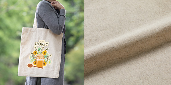 A3サイズの雑誌やカタログが収納出来る「コットンリネンバッグ(L)」は綿と麻を掛け合わせた生地で作られており、程よいシャリ感と柔らかさを持ち合わせた自然な風合いが特徴となりメインだけでなく折り畳んでサブバッグとしても重宝します。持っているだけでこなれ感のあるバッグはレディース向けノベルティとして人気が高く、アパレルショップや雑貨屋など女性が多く訪れる場所で活用されています。そのまま使用されますと少し寂しい印象になりますのでロゴやオリジナルデザインを印刷するオーダー制作が定番です。上画像はフルカラーのデザインとなり華やかながら落ち着きのある印象です。またシンプルに1色印刷をすると派手さはないですがお洒落で洗練された逸品に。