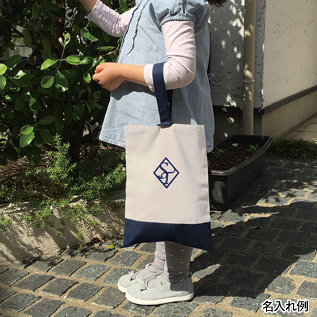 上履きやスリッパなどのシューズ入れとして役立つ可愛いツートーンカラーのシューズバッグです。ヨコが約230mm、タテが約300mmとなり出し入れ部分はループタイプなのでお子様でも簡単です。ネイビー×ブラックのみリバーシブル仕様になっておりますので気分に合わせて使い分けも可能です。