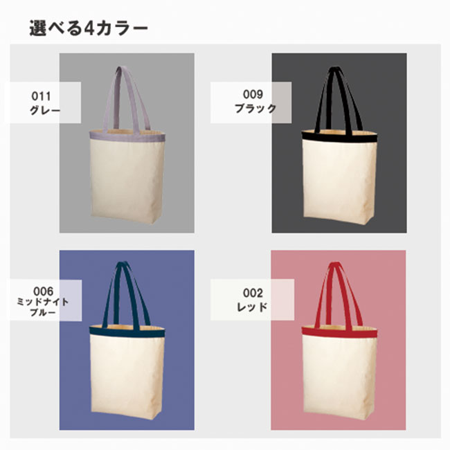 口元とハンドルのカラーに大人の遊び心を感じる「キャンバストップカラーベルトライントート」。中身が透けず柔らかな素材感の10オンスのコットン生地を使っており、デイリー使いに最適なトートバッグです。激安の単色印刷はもちろんフルカラープリントも可能ですので、ショップの先着ノベルティやイベントの物販グッズにご活用ください。