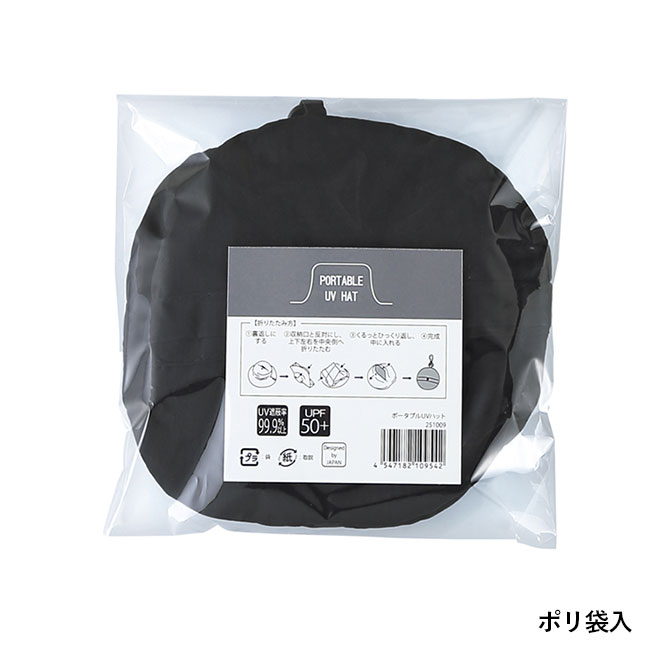 「ポータブルUVハット」は、小さく折りたたんで持ち運べるUVハットになります。合わせる服を選ばないスタンダードなデザインの黒いハットは、UV遮蔽率99.9%以上と高い日除け効果を発揮。旅行する際や、レジャーシーンの日焼け対策に最適です。レディースのフリーサイズで、アジャスター付きのゴム紐で大きさを調整できます。収納時の目立つ位置に印刷スペースがございますので、店名などを格安名入れし、アウトドア用品店のノベルティや屋外フェスの物販などにいかがでしょうか。