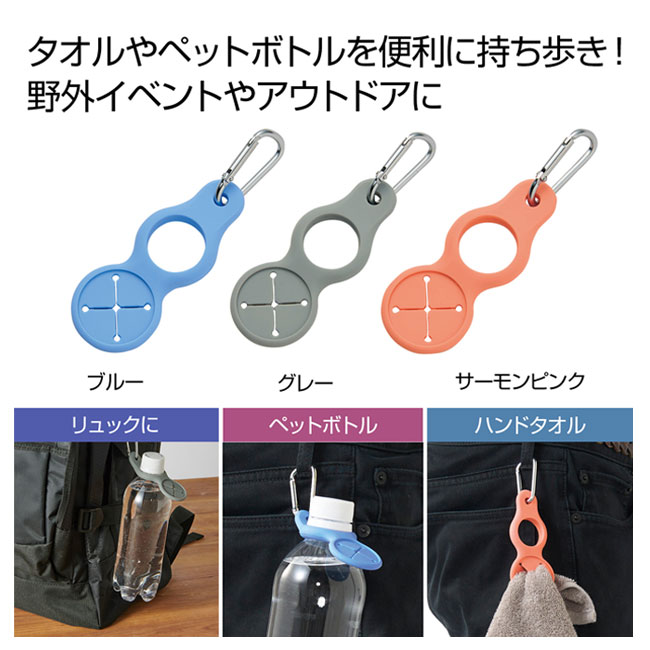 野外活動中にすぐ手に取りたいタオルやペットボトルを快適に持ち歩けるホルダーが、「カラフル タオル&ペットボトルホルダー1個」です。ペットボトルの飲み口とハンドタオルを取り付ける穴が別々についているので、これ一つで暑さ対策はばっちり。柔らかなカラー展開はキーホルダーとして日常的に携帯しやすく、社名をプリントすることで宣伝効果も期待できます。本体価格も激安ですので、スポーツ用品やアウトドアグッズの購入特典ノベルティにいかがでしょうか。