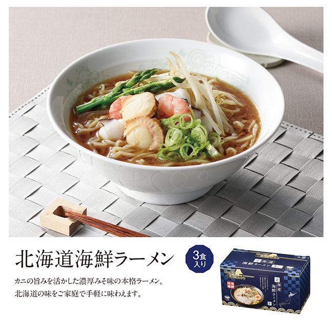 北海道の本格ラーメンをご家庭で味わえる「にっぽん美食めぐり 北海道海鮮ラーメン3食入」。カニの旨味を活かした濃厚みそ味の海鮮ラーメンです。こだわりの素材を使った本格派の味わいをお手軽にお楽しみください。イベントの景品やお祝いのギフトにお薦めです。嬉しい3食入りで、通販ならではの激安価格でご注文頂けます。