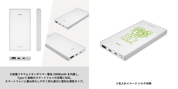 「PD20Wモバイルバッテリー10000 ホワイト」は、PD(急速充電)タイプのモバイルバッテリーです。Type-C対応で、10000mAhの大容量リチウムポリマー電池を内蔵。薄型なので持ち歩きやすく、外出先や仕事に重宝します。表と裏の名入れ可能範囲はフルカラー印刷も可能ですので、写真やイラストを名入れした特注品の制作にもおすすめです。社員への記念品や限定グッズ制作などにご活用ください。