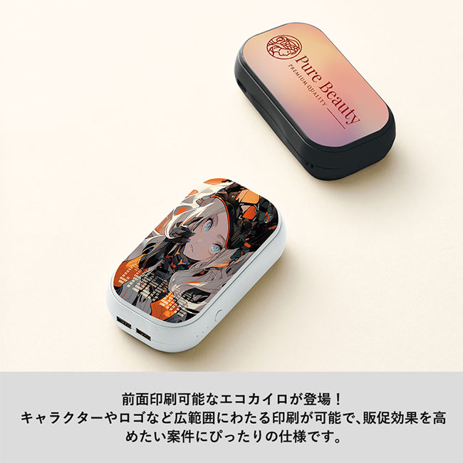 「全面印刷できるUSBエコカイロ」は、カイロとしてだけでなく充電器としても使えるアイテムです。寒い季節、小さく携帯できるカイロがあったら誰でも嬉しいものです。こちらの商品は予め充電しておけば約40℃、45℃、50℃の3パターンの温度設定にする事が可能で、ポケットに入れて温めるのもよいですし、手先のかじかみを癒すのにもピッタリ。大きくオリジナルデザインをフルカラー印刷出来ますので、PR効果を狙ったノベルティ製作にも最適です。