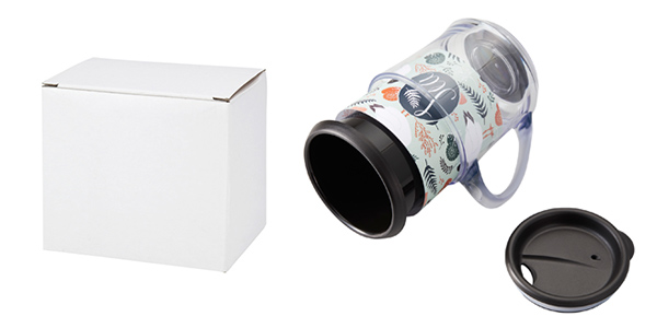 取っ手付きで持ちやすく、台紙の入れ替えでカスタマイズも可能なマグカップになります。幅広いオリジナルのロゴ入れや社名入れを行うことができ、320mlの容量があるので様々なノベルティや物販グッズとしての激安な制作が可能となっています。