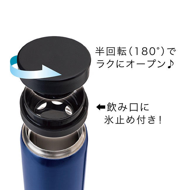 保冷温効果、軽量、大容量と素敵なポイントの多い当ステンレスボトルには蓋や飲み口も一工夫がされています。蓋は半回転で簡単に開け閉めができ、飲みたい瞬間に直ぐ対応出来ます。また氷止め付きの飲み口となりティーバッグや氷を入れても飛び出てくる心配がありません。また広口の口径なので大きめの氷も入れやすいです。