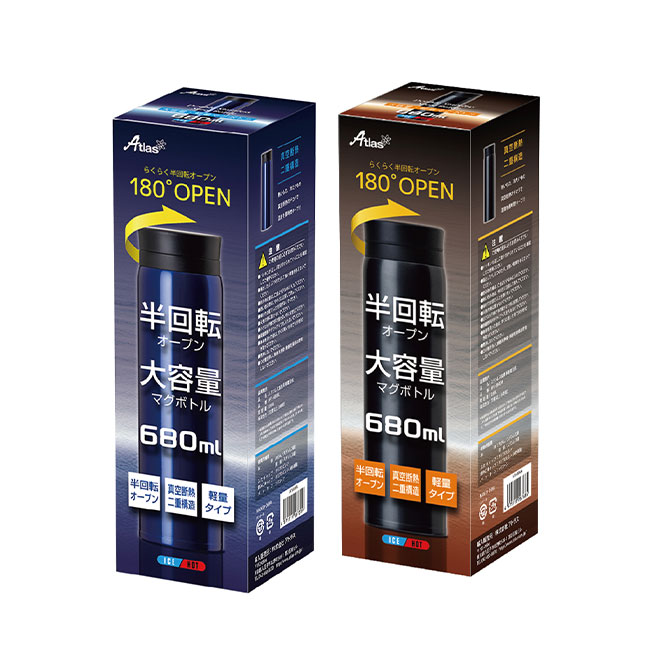 保冷・保温に優れた真空二重構造の680ml大容量サイズのステンレスボトルがアトラスより登場!定番カラーのみを厳選したブルーとガンメタの2色展開も魅力の一つ。ブランドロゴなどでボトルがデザインを邪魔する事なく販促に特化したレーザー印刷や名入れプリントが可能です。成約記念やスポーツ大会の特典などノベルティと言うより記念品ボトルとしてオリジナル製作されるアイテム。