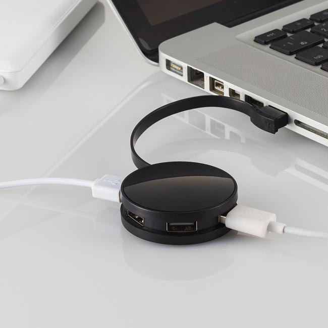 ラウンド型の本体に4つのポートを装備したUSBハブ。収納時は本体にコードを巻いてよりコンパクトになるので、カバンやポケットに入れてオフィスや出張でも大活躍のノベルティグッズです。
