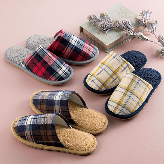 「プレード/チェックボアスリッパ」は、チェック柄とボア部分の色使いがお洒落なスリッパです。底面は静音効果のある素材を使用しているので、足音が鳴りにくいのも嬉しいポイント。男女ともに使いやすいデザインですので、幅広い方にご利用頂けるアイテムです。家具用品店での冬のキャンペーンノベルティや、イベントの記念品等にお薦めです。格安の値段で制作出来ますので、是非オーダー下さいませ。