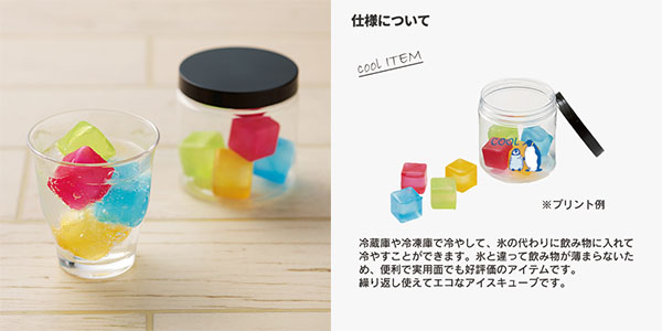 氷の代わりになる「アイスキューブ(ボトル付)」は夏に大活躍するエコグッズです。氷と違い時間がたっても飲み物の味が薄くなる心配がないので最後までおいしく味わう事が出来ます。収納ボトルには3ヵ所名入れを印刷する事ができ飲料メーカーの応募キャンペーンや店舗の購入ノベルティにお勧めです。