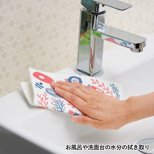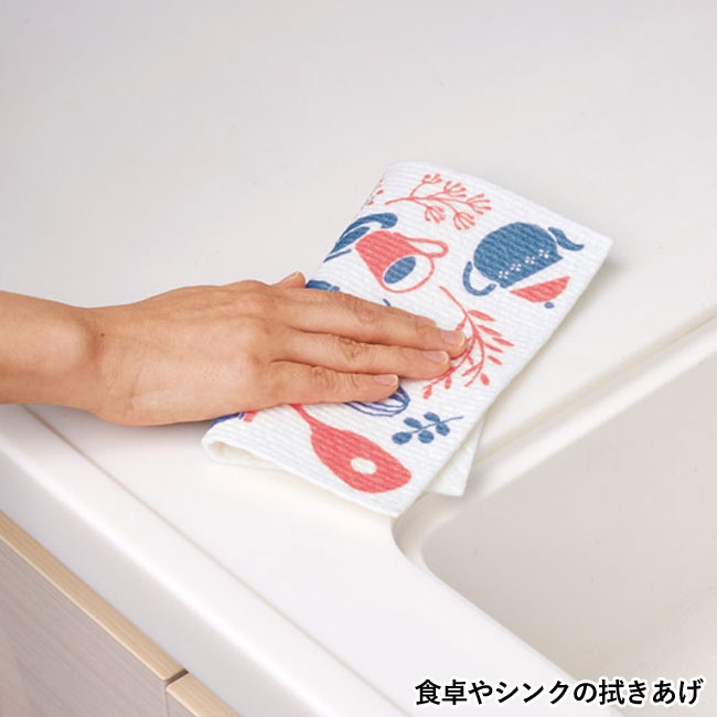 「レポア セルロースクロス」は、天然素材のセルロースを使った環境に優しいキッチンクロスになります。吸水性に優れ、キッチン回りの掃除、食器の水切りマット、洗面所の拭き取り、窓掃除などマルチに活用できて便利。キッチン雑貨をデザインした絵柄が可愛らしく、見た目に華があります。格安価格の商品ですので、ばらまき用のノベルティにぴったりです。ドラッグストアやスーパーで配布する店舗ノベルティ、アンケート回答のお礼などにいかがでしょうか。