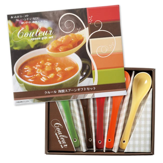 陶器製のフレンチカラーがおしゃれなスプーンが5本入ったギフトセット。ファミリーや料理好きの客層に贈って喜ばれるプチギフトに。おしゃれなイメージアップに繋がる効果的な販促品です。
