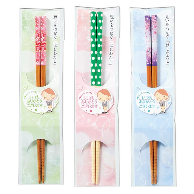 感謝のイラストがかわいいパッケージ入りのお箸。名刺と一緒に渡すポケット付きで、銀行窓口や会員制のサービス業などでお客様へ贈る粗品として。上品な日用品の格安販促グッズです。