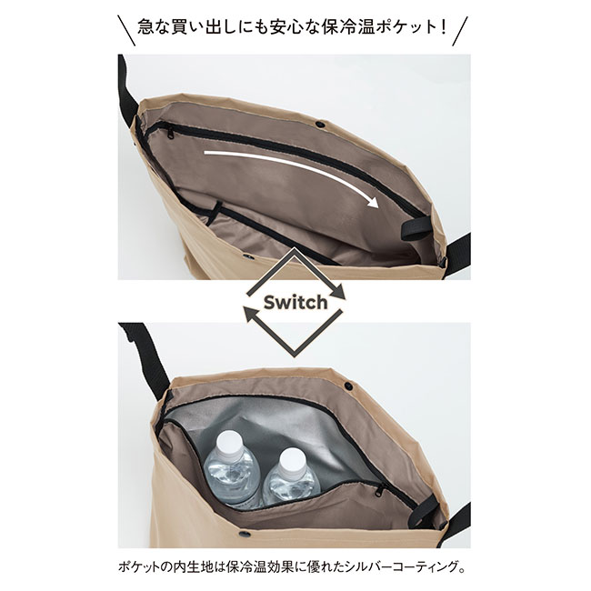 一見するとデイリー用バッグの「保冷温スイッチショルダー」は、内側に保冷温ポケットを兼ね備え、保冷温バッグとしても使えるダブルユースなショルダーバッグです。シルバーコーティングが施されたファスナー付きの内ポケットは、アイスを購入した時や冷たい飲み物を持ち歩く際に重宝します。小さく折りたたむことができ、旅行やレジャーシーンのサブバッグにもお薦めです。アパレルショップのノベルティ、アウトドアイベントの記念品などに当店での格安オーダーメイドをご検討下さいませ。