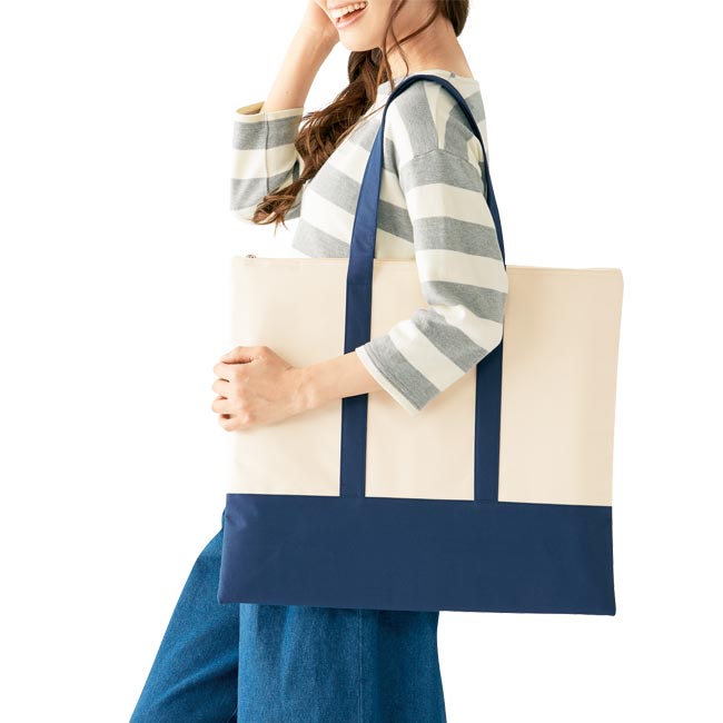 バッグ底面のボタンでマチの形状が変えられる2WAYバッグ。内部のアルミ蒸着フィルムとファスナー仕様の口で保冷温効果にも優れる大容量のバッグです。会社名を入れて実用的なノベルティにも。