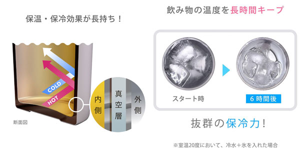 内側と外側に真空のスペースをつくることで、外気の影響をうけにくくした「真空断熱二重構造」を採用。中にいれたドリンクの最適な温度を長時間キープしてくれます。抜群の保温・保冷力があり、氷が溶けにくく結露もしにくくなっています。ホットの飲み物を入れても持ち手の部分は熱くならないので安心。テレワークの水分補給はもちろん、晩酌のお供として活躍するでしょう。当通販ショップでは、格安価格で注文いただけますので、ぜひご活用ください。