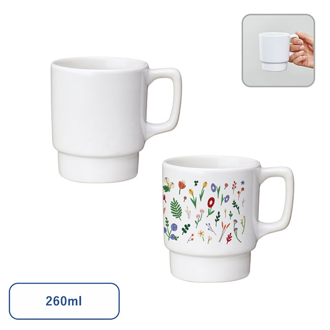 ヴィンテージマグのようなフォルムの「陶器マグ スタッキング」。コーヒーや紅茶を入れるのに最適なおしゃれマグとなっています。重ねることができるのでご自宅での収納もラクラク。フルカラーによる名入れ製作にも対応しておりますので、カラフルなイラストやロゴデザインで販促効果の高いノベルティをご注文ください。飲食メーカーの特典ノベルティやカフェの開店記念品などにいかがでしょうか。