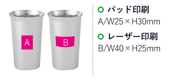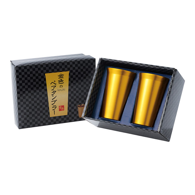 ゴールドカラーが特徴的な高級感のあるペアタンブラーです。オリジナルの企業名入れなどを行い、ノベルティや記念品、贈答品としての製作も人気となっているアイテムです。ビールなどを注ぐのに最適で、飲食店など店舗の限定グッズとしてもおすすめです。