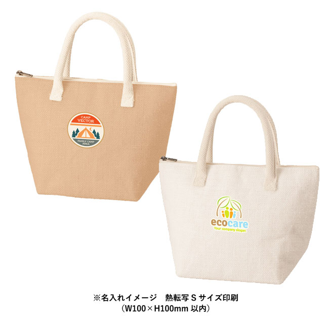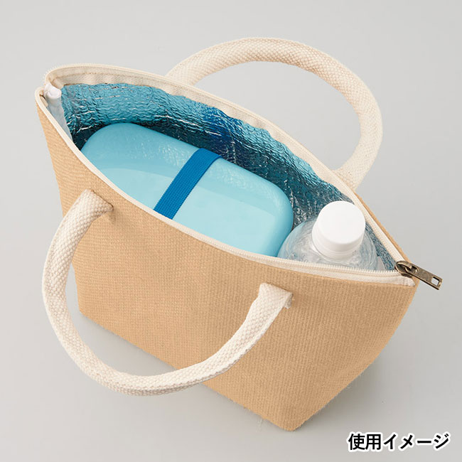 「ジュート保冷トート(S)」は、外側はジュート素材、内側は保冷温に優れたアルミ蒸着のランチトートです。持ち手は丈夫なパイプハンドルなので、お弁当やペットボトルなど重たいものを入れても安心。ジュートバッグはファッションアイテムとしても人気ですので、機能的でお洒落に持ち歩けるこちらのトートは女性には特に好まれます。ブランドロゴやイラストを名入れし、カフェや雑貨店の激やノベルティ制作にいかがでしょうか。