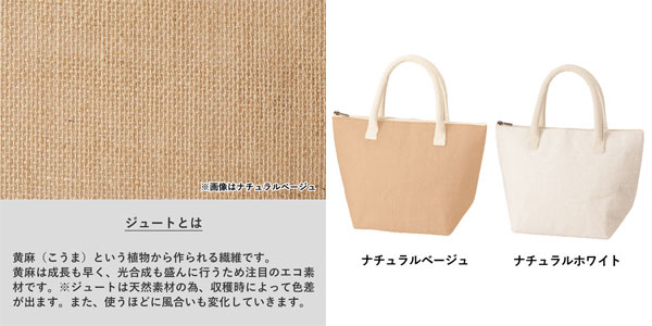 「ジュート保冷トート(S)」は、麻の一種である黄麻(こうま)を使用したランチトートです。光合成を盛んに行う黄麻は、環境に優しい素材として注目されています。ジュートらしいナチュラルなベージュと、清楚なホワイトカラーの2色展開です。