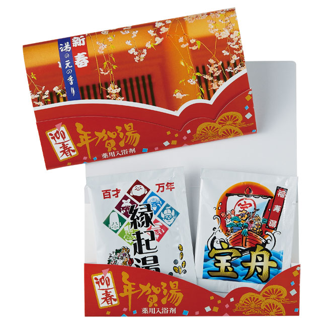 縁起のいい迎春デザインの化粧ケースに入った「新春年賀湯(2包入)」。薬用入浴剤が2包入ったセット商品で、入浴剤の個装パッケージもお正月にぴったりなデザインとなっています。男女問わずシニア向けにもお薦めのアイテムですので、アンケート回答の粗品やお正月グッズの購入特典など様々な場面でご活用ください。当ノベルティ・ギフトモールでは、2包入りで激安価格にてご注文頂けます。