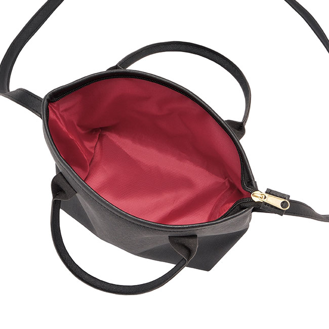 ブラックのレザー調生地とレッドの内生地が高級感を演出するおでかけバッグです。ショルダーバッグとしても手提げバッグとしても使える2WAYタイプで、名入れのオリジナル印刷なども可能なので、ノベルティや物販品としての格安な制作も人気です。