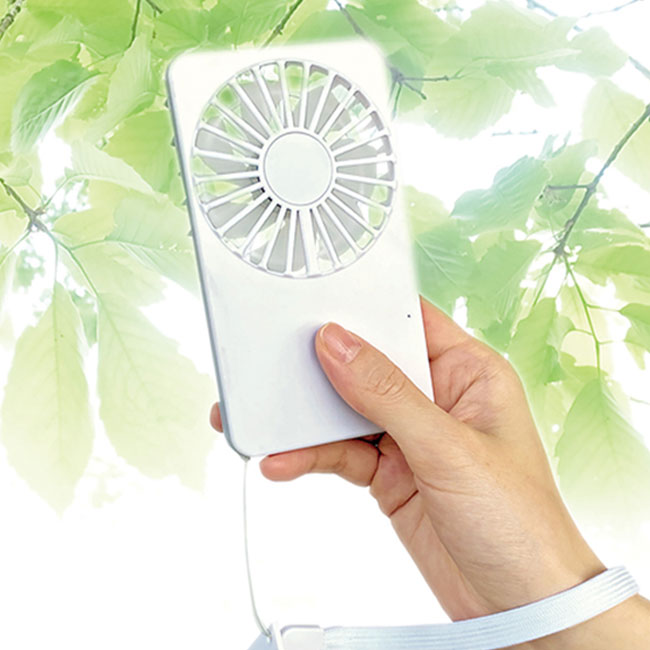 「スリムカードファン」は、小さくて軽いカード型のモバイル扇風機です。胸ポケットに入るほどの大きさで、重さはたったの69g。手に持ちやすいストラップが付いているのでハンディファンとして活躍し、付属のスタンドチップを取り付ければ卓上ファンになる2WAY仕様です。スーツのポケットや通勤カバンに入れやすく、ビジネスマンに重宝します。セミナーや展示会のノベルティに喜ばれますので、ぜひ当店の激安名入れ製作をご検討くださいませ。