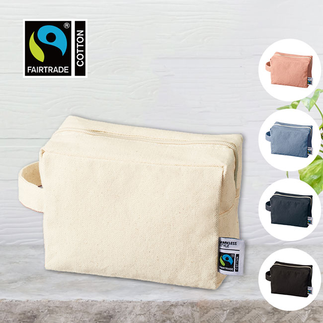 「フェアトレードコットンキャンバスファスナーポーチ(M)」は、ステーショナリーやコスメが十分に入る長方形型のスクエアポーチ。側面には持ち運びに便利なハンドルが付いていて、デザインの良いアクセントになっています。フェアトレードコットンで製作されており、認証タグが付いているのがポイント。エコ関連イベントのグッズ制作や、オーガニックコスメの購入特典ノベルティに最適です。