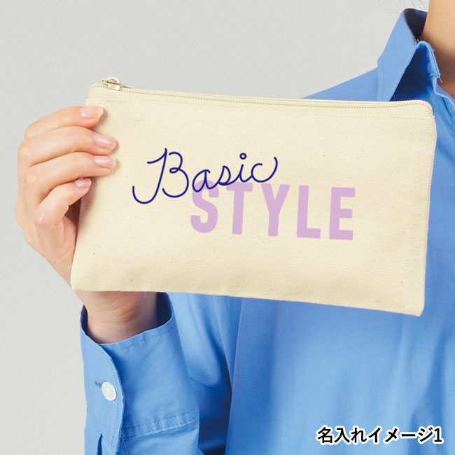 12オンスの厚手生地が丈夫で頼もしい「12オンス・厚生地フラットコットンポーチ(SS)」です。横に長いフラットタイプのポーチは、ステーショナリーやコスメを収納するのに役立ちます。ブランドや企業のロゴを名入れするだけでもお洒落なノベルティになるので、アパレルの購入特典や雑誌の付録にお薦めです。オリジナル製作は、通販ならではの格安価格にて名入れ注文を承る当店にお任せ下さい。