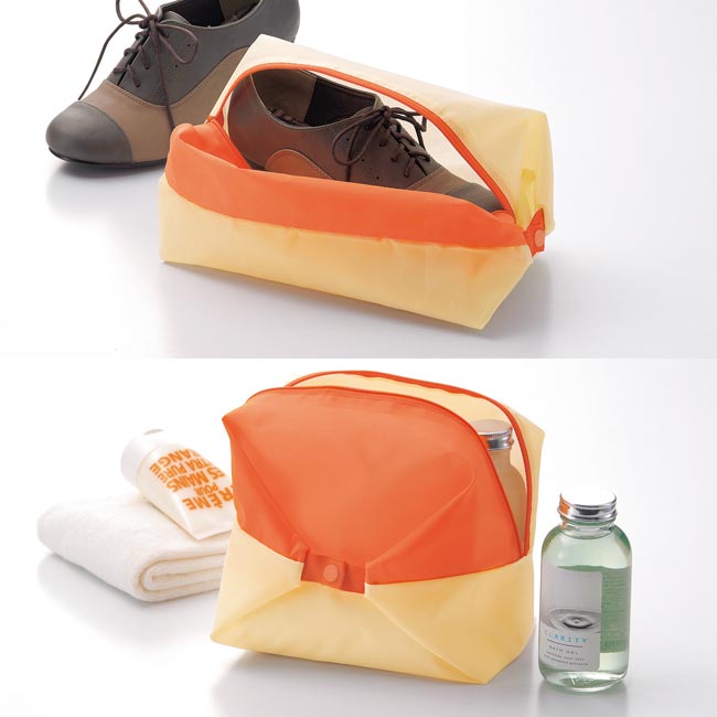 ボタンの留め方で形状を変えて3WAY使用ができるマルチポーチ。靴や小物、衣類等収納する物によって使い分けられるのでジャンル・業種を問わず幅広く活用できるノベルティになります。