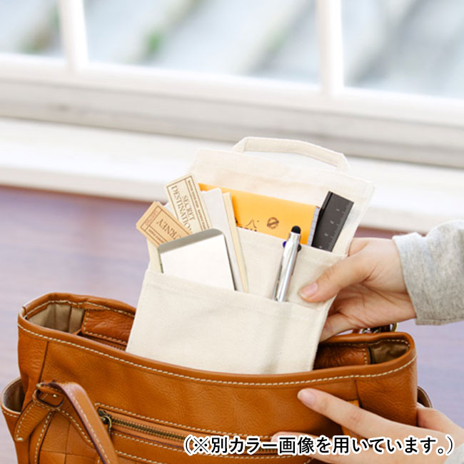 バッグインバッグ(ウォールポケットタイプ)(ナチュラル)はスマートフォンやイヤホン、文房具などを整理して収納する事ができます。印刷範囲も広いため、比較的に目の付き易い場所に社名などをプリントする事でオリジナルノベルティを作成する事で、企業の知名度アップに期待出来ます。雑貨などを取り扱っているショップでの周年記念などに活用できる販促ツールです。