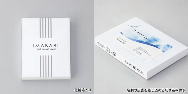 化粧箱には「IMABAI」と書かれており、外装からも品質の良さが伝わります。裏面に名刺を差し込めば、ビジネスシーンにおいて喜ばれるプチギフトに。かさばらない薄型のパッケージは、持ち帰りやすくお渡する相手への気遣いが伝わります。