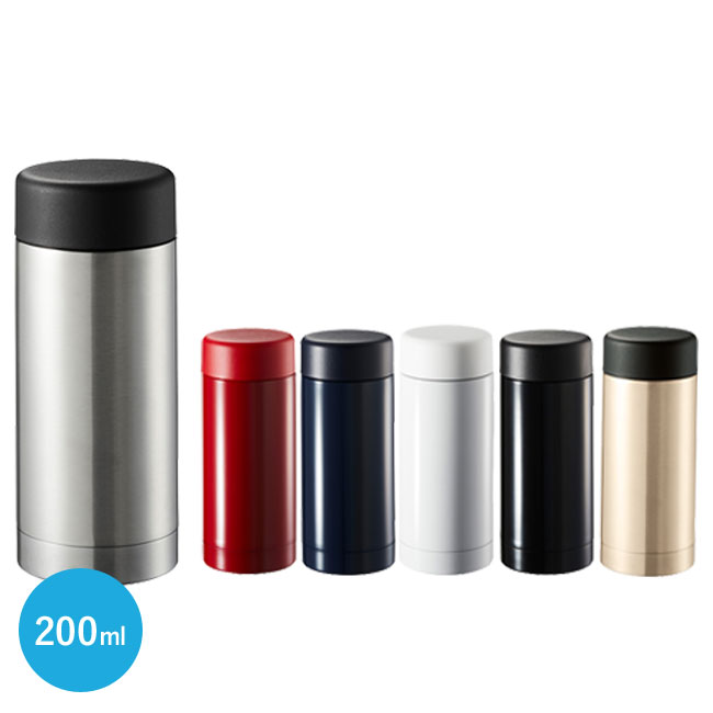 ノベルティや周年記念品の製作にピッタリな定番ステンレスボトル。豊富な6色の中からオリジナル作成に利用する事ができ蓋や側面に名入れやイラストなどお好きなデザインで印刷する事が可能です。ブレイクタイムに丁度いい約200mlの容量で男女問わず贈って喜ばれるアイテムです。