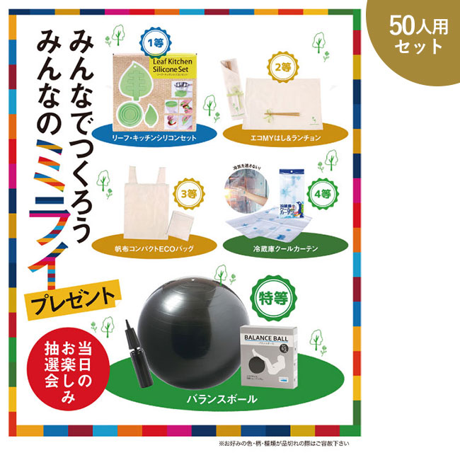 話題のSDGsアイテムがもらえる「みんなでつくろうみんなのミライP50人用」。エコバッグやバランスボールなど、エコ活動や健康に繋がるアイテムを特賞から4等まで取り揃えております。総当たり50人に当たるイベントキットですので、住宅展示場やショッピングモールで行うエコイベントなどにぴったり。お楽しみ抽選会や来場記念品としてぜひご活用ください。くじやお知らせPOPなども付属して激安の値段でご注文が可能です。