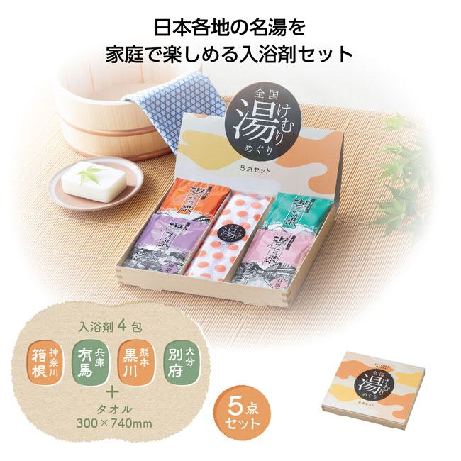 箱根、有馬、黒川、別府の名湯をイメージした入浴剤と、泡立ちの良い綿100%のタオルをセットにした「全国湯けむりめぐり5点セット」です。豪華な化粧箱に包まれた入浴剤セットは特別感があり、家庭で手軽に日本各地の温泉を旅する気分が味わえます。豪華な5点セットのバスギフトを当店では通販ならではの格安な値段でご発注いただけますので、物産展の入場記念品や温浴施設のノベルティとしての大ロット発注にお薦めです。
