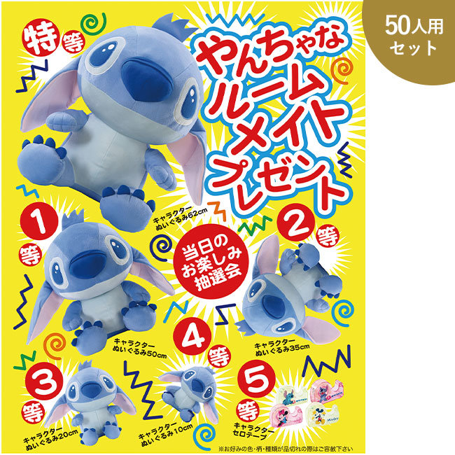 やんちゃなキャラクターのぬいぐるみが当たる抽選箱付きのイベントキット。お子様に人気のキャラクターぬいぐるみは5種類のサイズが当たるワクワクする抽選会になります。50人用セット。