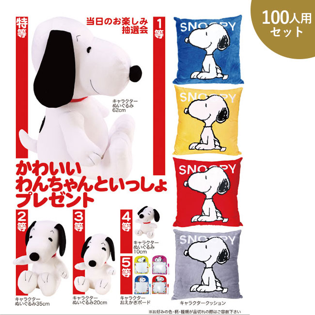 かわいいわんちゃんグッズが当たる抽選箱付きイベントキット。色々な大きさのぬいぐるみやキャラクタークッションなど、ファンにはたまらないイベントに適した100人用のセット。