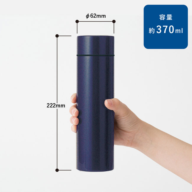 メタリックな艶のある塗装が高級感を与えるミニボトルが、「フルメタリックサーモボトル370ml」になります。容量370mlのステンレスサーモボトルは、保冷温に優れていて季節問わず使用OK。スタイリッシュな4色のカラー展開は、どちらの色をお選びいただいてもラメの光沢が美しく見えます。激安な1色名入れ印刷でロゴやワンポイントイラストを印刷するだけでもプレミアムな仕上がりになりますので、カフェの周年ノベルティやセミナーの記念品などにご活用ください。