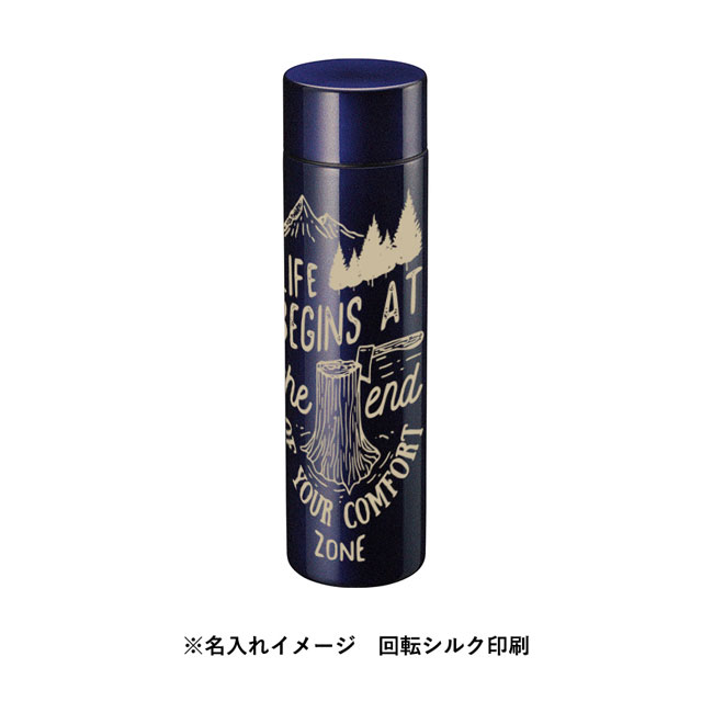 「フルメタリックサーモボトル370ml」のプリント範囲は、側面と天面にそれぞれございます。側面いっぱいにロゴやイラストを名入れする回転シルク印刷は、お洒落で物販グッズにもお薦め。天面のロゴプリントも、目立つので良いアクセントになります。