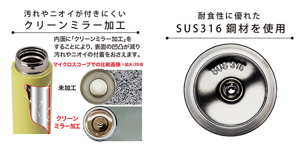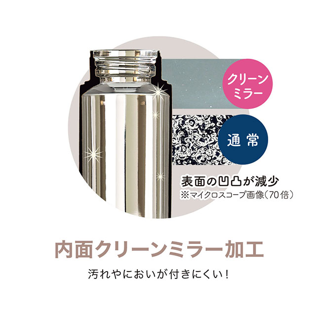 スポーツドリンクにも対応しているSUS316ステンレス鋼を使用したマグボトルの内面はキラキラと美しいクリーンミラー加工がされており、綺麗に磨かれた表面には凹凸が少なくなり着色や茶渋等の汚れやドリンクのニオイ移りからボトルを守ってくれます。