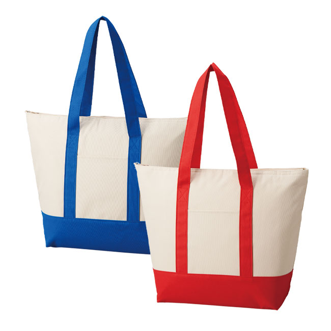 ショルダー使い可能な使いやすいビッグサイズ。ブルーとレッドの選べるカラーがアクセントになっています。外ポケット部分にショップロゴや企業名などを名入れ印刷して、夏季ノベルティや主婦向けのキャンペーンなどにご活用ください。格安価格で特注プリントを承っております。