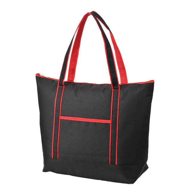 容量もしっかりと確保されているレジャー向けのトートバッグになります。名入れやオリジナルデザインの印刷やプリントなども格安な値段で行うことができ、ブラックを基調としたカラーで様々なシーンで活用できるノベルティ、店舗物販グッズに活用できます。
