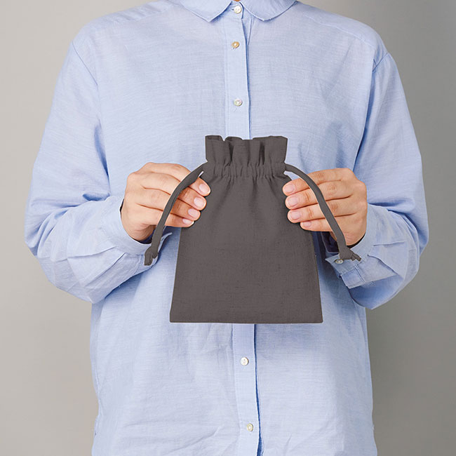 コスメ道具やピアス類のアクセサリを収納する際に便利なSサイズのコットンリネン巾着です。柔らかくも張りのある生地で名入れやオリジナルデザインのプリントも綺麗に映えます。販促ノベルティとしては勿論、お菓子やサンプルを詰め合わせて新規オープンの記念品プレゼントにもオススメです。